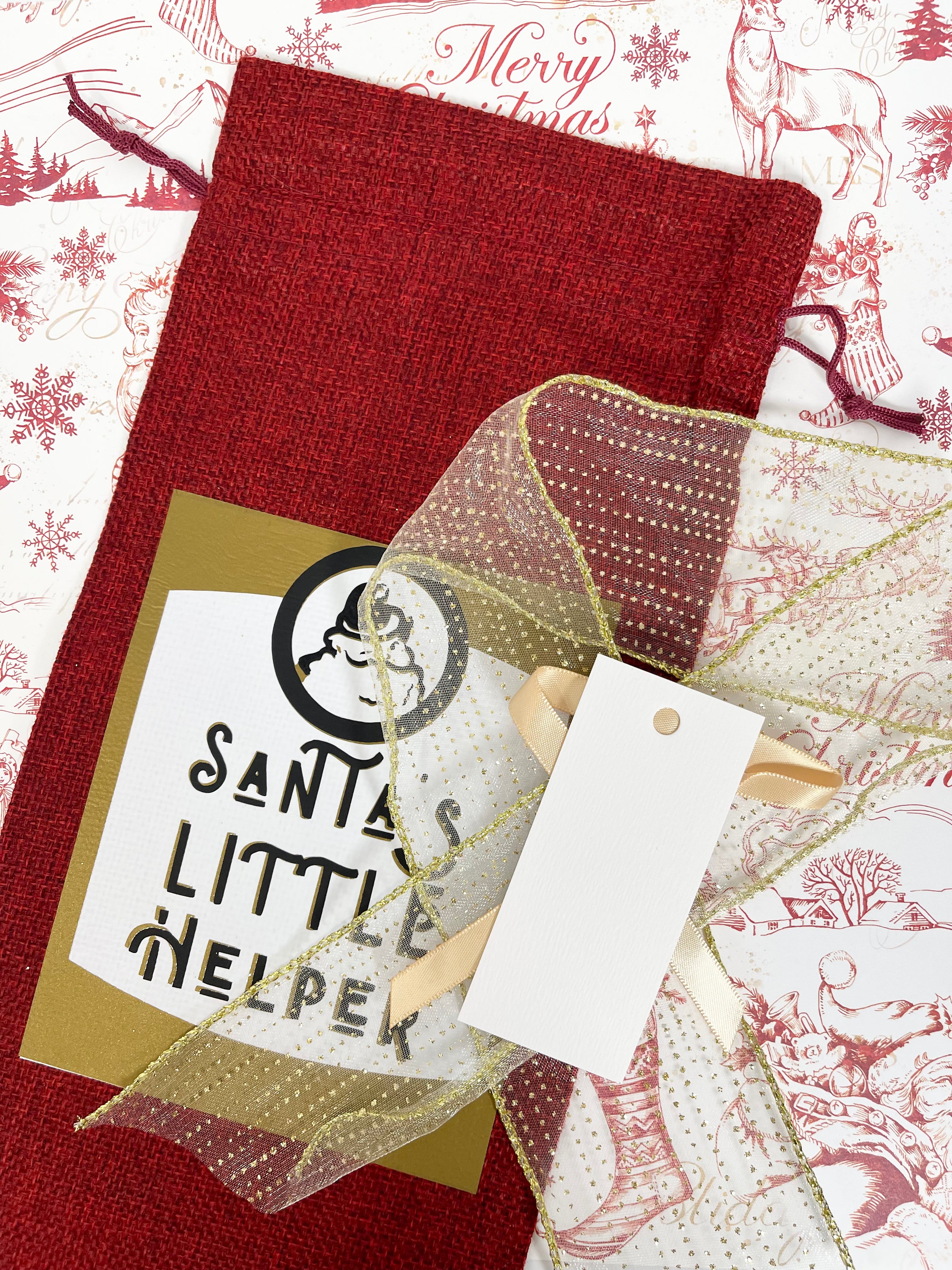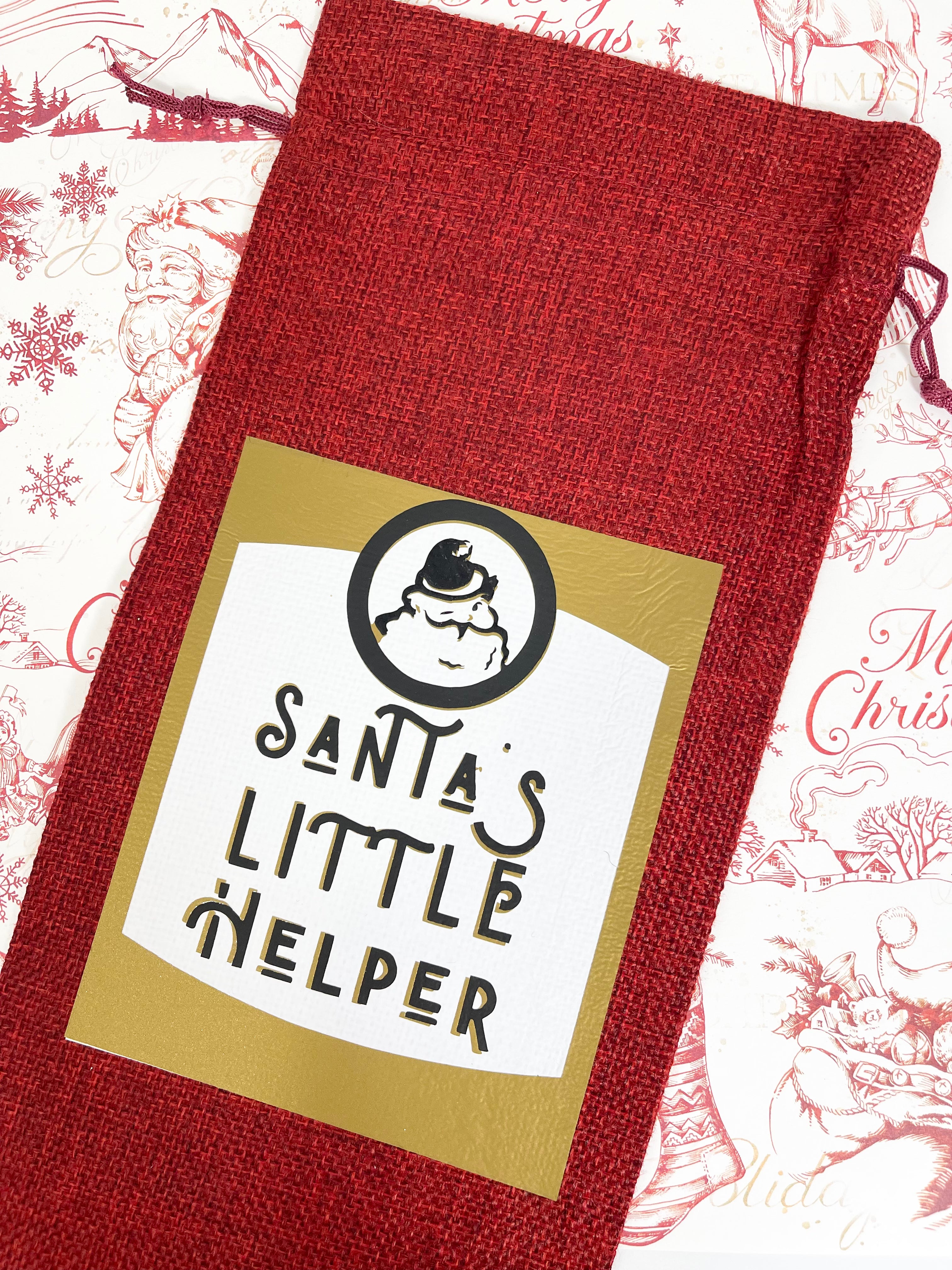 Santa’s Little Helper: Reusable, Burlap Wine Bag With Ribbon and Gift Tag